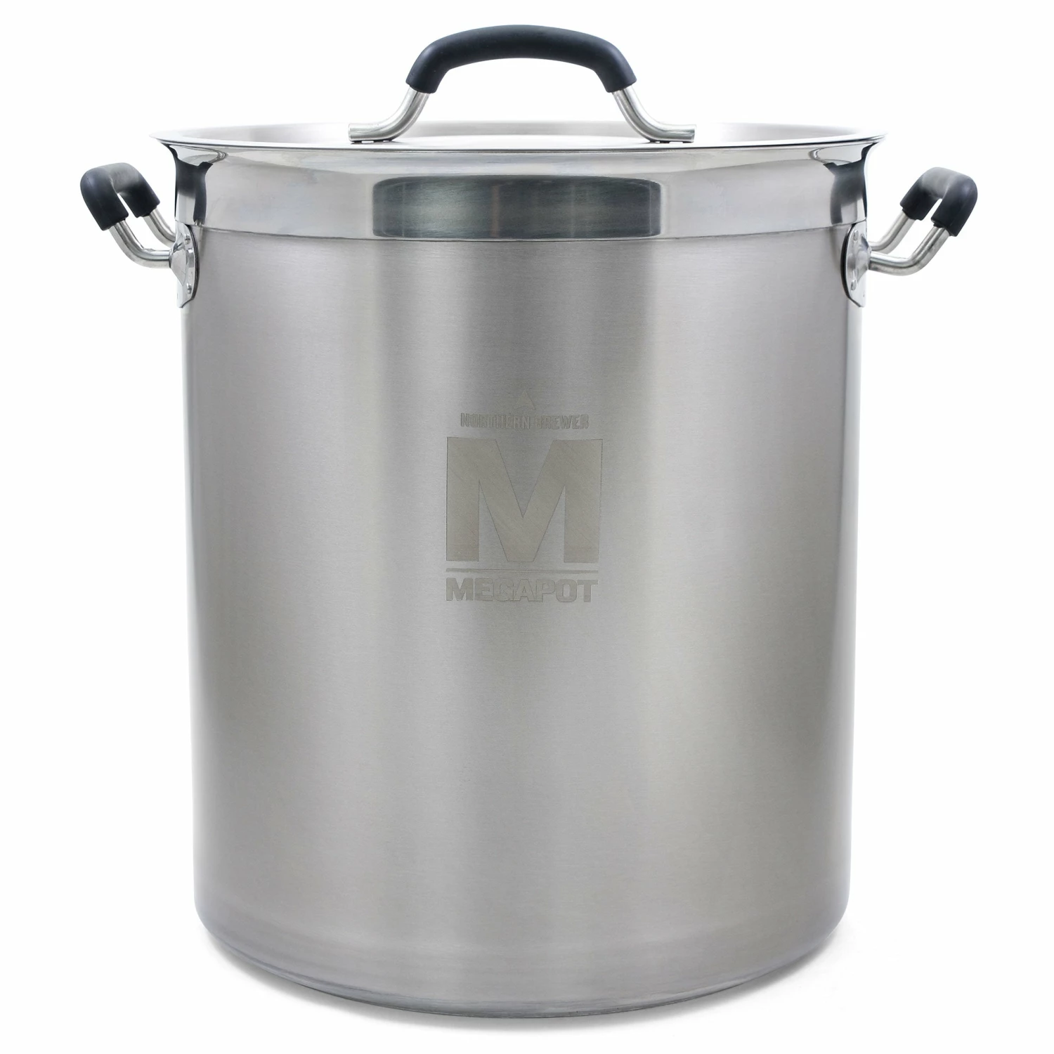 MegaPot is a stainless steel masterpiece, not just another stainless steel stock pot. Every detail has been thought through to enhance the beer making experience. Crafted of 304 stainless steel for ease of cleaning. Stay cool silicone handles on the kettle and lid serve to limit scorching! The handles are riveted in place to aid in lifting a hot liquid-filled pot. No weld failures here! A polished stainless steel band surrounds the upper rim, reinforcing rigidity of the pot while adding a little bling. And that’s not all. We’ve added the feature that every brewer wants in a kettle – graduated volume markers inside the kettle – one at each gallon. No more need for a sight glass! The heart of the kettle is a 4mm thick Tri-Clad bottom- made specifically for even heat distribution. The 1 to 2 proportion of MegaPot has been scientifically designed to promote a vigorous boil and reduce off-flavors. And last of all, the MegaPot logo is stamped on every kettle. When you have the best, show it off!