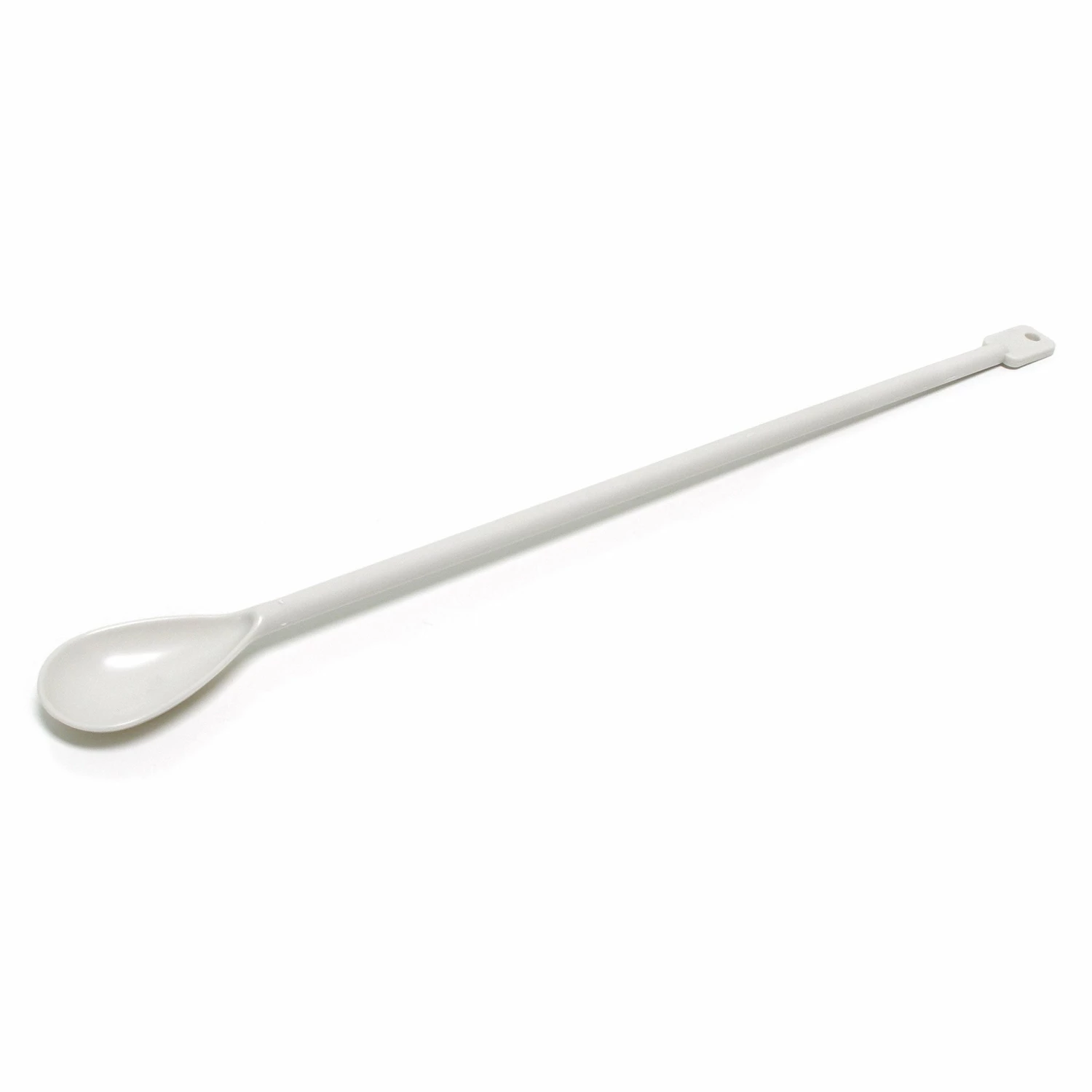 Food grade plastic spoon can tolerate contact with boiling temperatures. The smaller end fits into carboy necks. Strongly recommended for use with plastic fermenters and bottling buckets, as it will not scratch them.