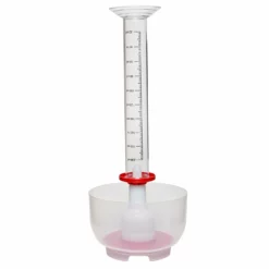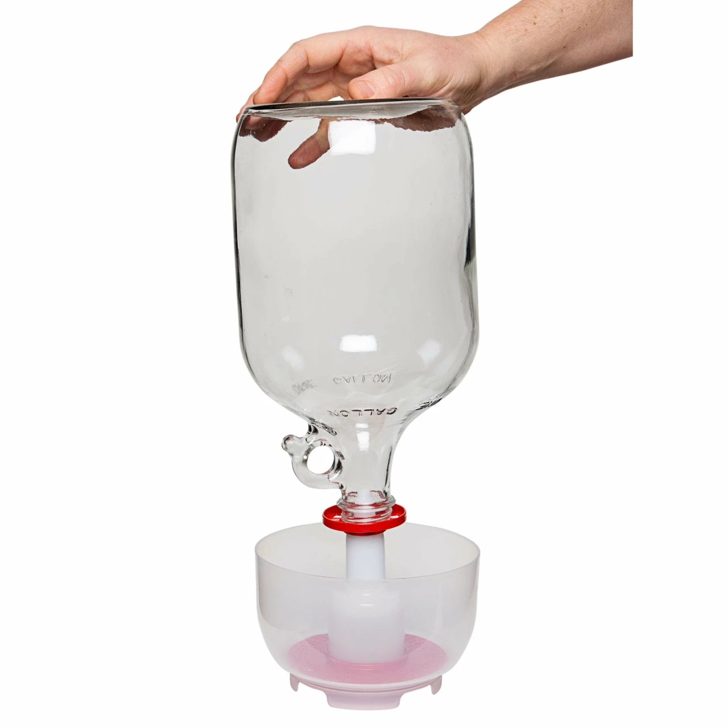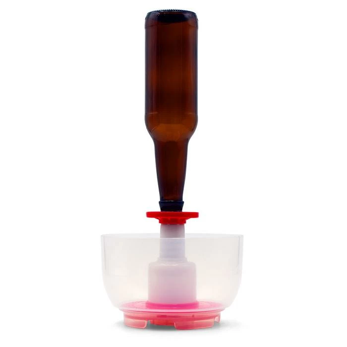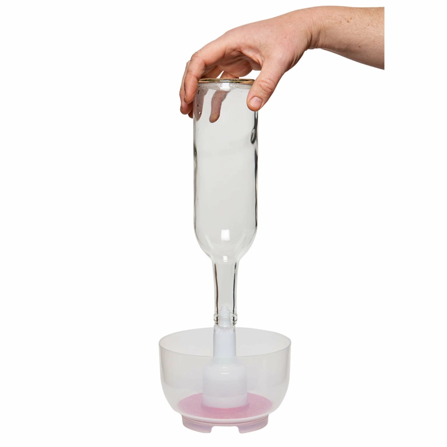 Easy to assemble, it is a breeze to use and clean. Bottle rinser reservoir with self-priming pump shoots a stream of sanitizer solution, sulfite solution, or rinse water when a bottle pushes down the nozzle. It also acts as a versatile addition to the top of the Bottle Tower with no adaptor required. May also be used independently on any flat surface.