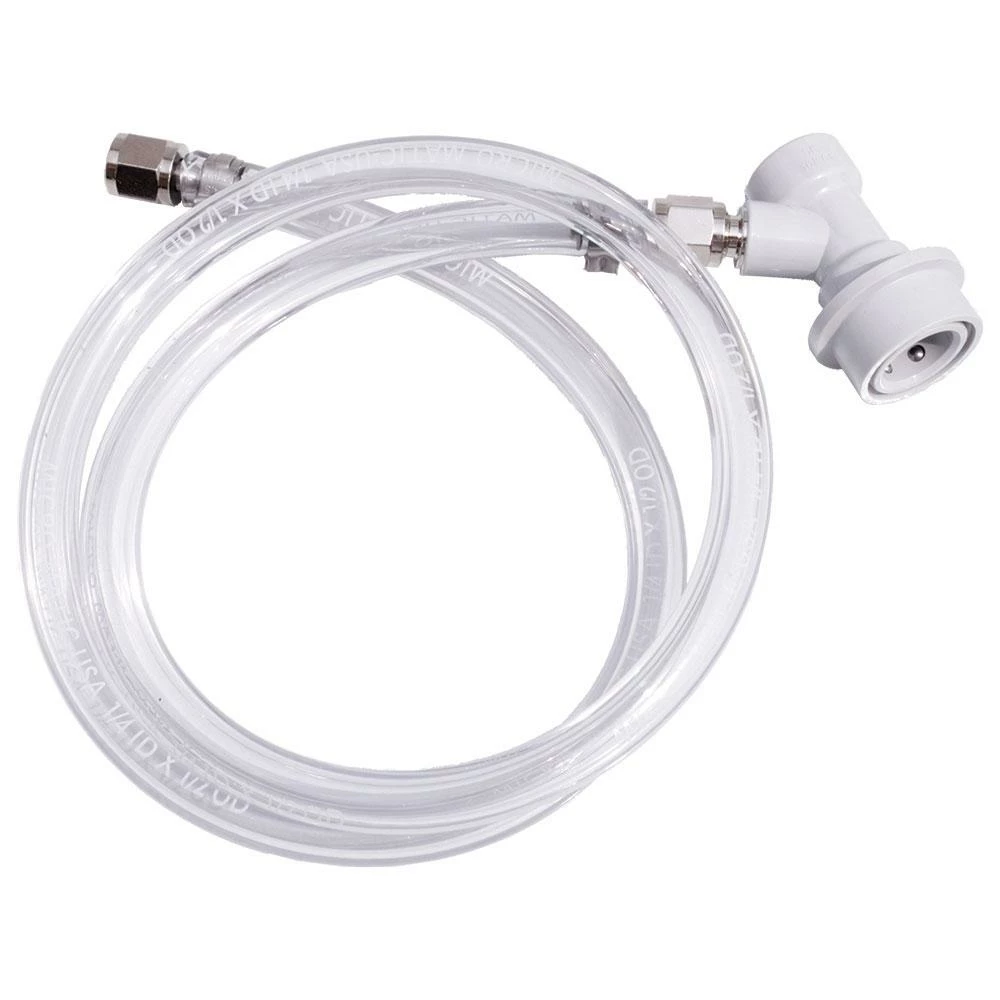 Contains a ball lock gas/in disconnect, and a 3 foot length of beverage tubing 1/4″ swivel nuts on each end. Connects to a 1/4″ MFL regulator outlet or CO2 gas distributor with MFL connections.